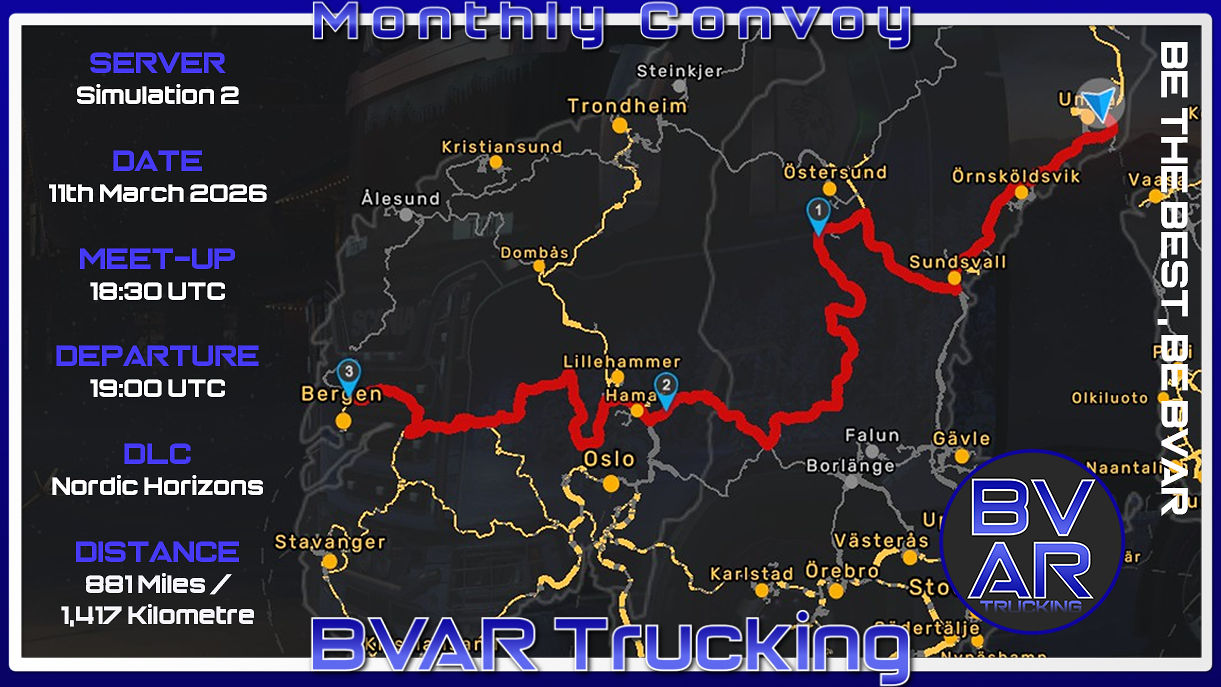 Join us for this scene drive from Umeå to Bergen. This is a journey of gradual scenic transformation. For this route we shall be exploring the Nordic Horizons DLC. The drive may demand attention, with a chance of slowing you down whether you intend to or not.